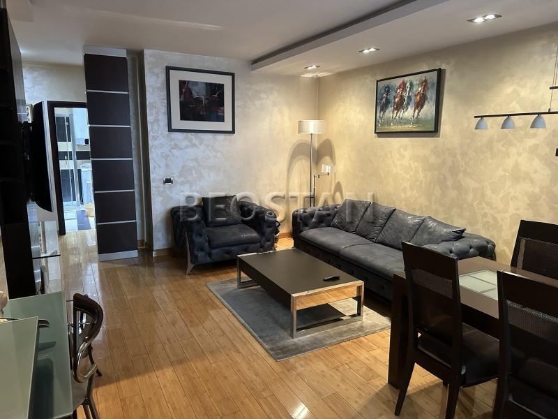Izdaje se dvosoban namešten stan u novoj zgradi sa kompletno novim nameštajem i belom tehnikom sa posuđem i posteljinom. Stan se sastoji od dnevno trpezarijskog dela, kuhinje, zasebne spavaće sobe, kupatila, predsoblja i terase. Grejanje etažno sa cenom po potrošnji. Stan se nalazi između Cvetkove pijace i novog BEO TC blizu mnogih tramvajskih trolejbuskih i autobuskih linija. Parkiranje bez zone u ulici. Male režije, klima. Wifi i kablovska televizija. Agencijska provizija 50% od prve zakupnine.